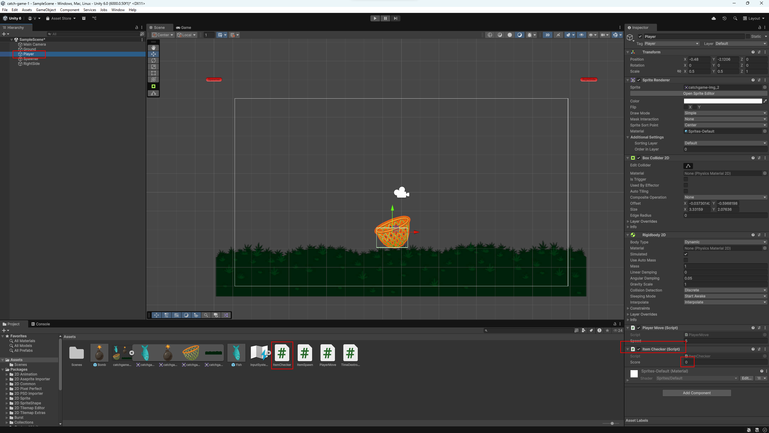 That’s it! You’ve built the core of a 2D catch game — items fall, the player moves, collisions are detected, and the score updates. A small prototype — but full of potential.