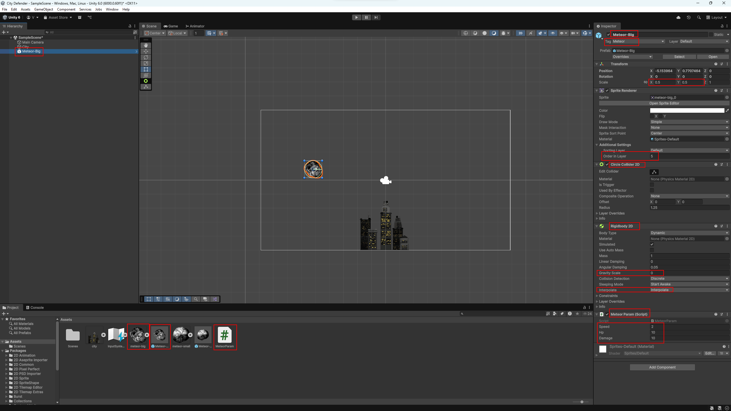 Then create a prefab: drag the meteor object from Hierarchy into the Assets folder.