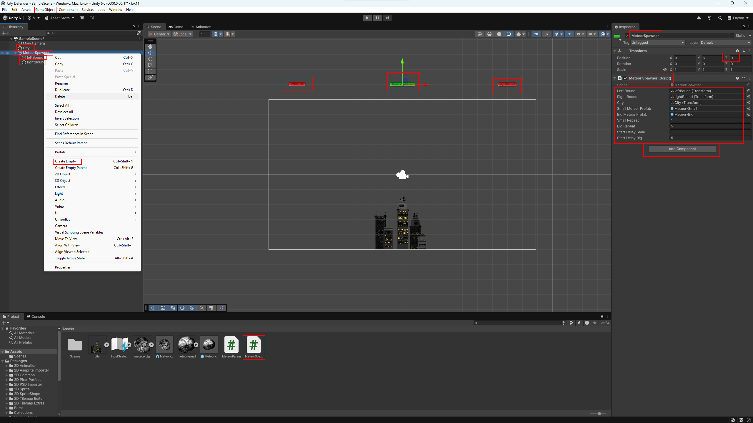 Now let’s write a script that will: pick a random X position between the bounds, spawn small and big meteors at different intervals, and set their flight direction toward the city (big ones — directly at the city, small ones — to a random point above the city line).