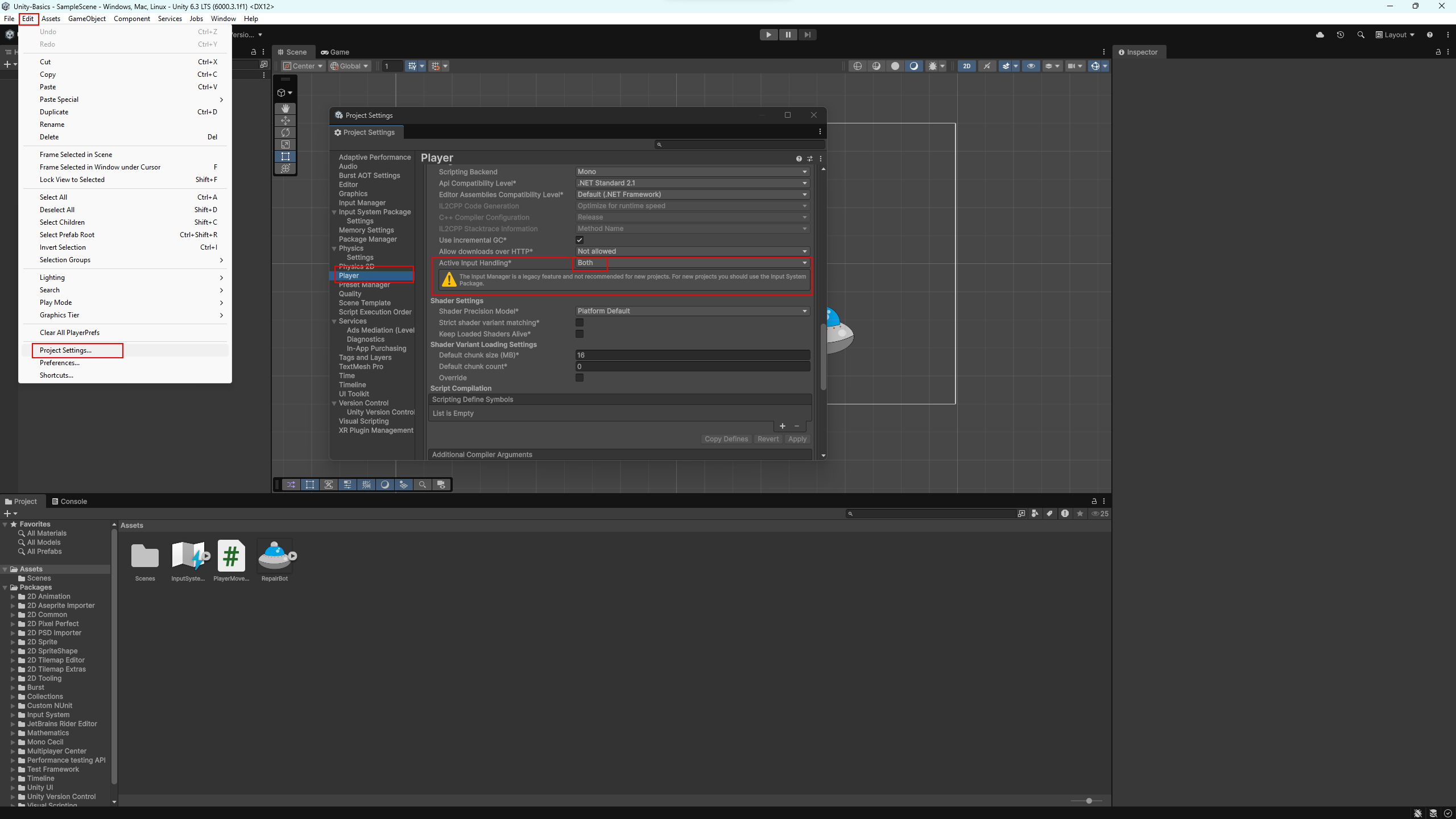 To enable simultaneous support for both input systems, open Edit โ Project Settings โ Player and set Active Input Handling to Both. After changing this setting, Unity will ask you to restart the editor.