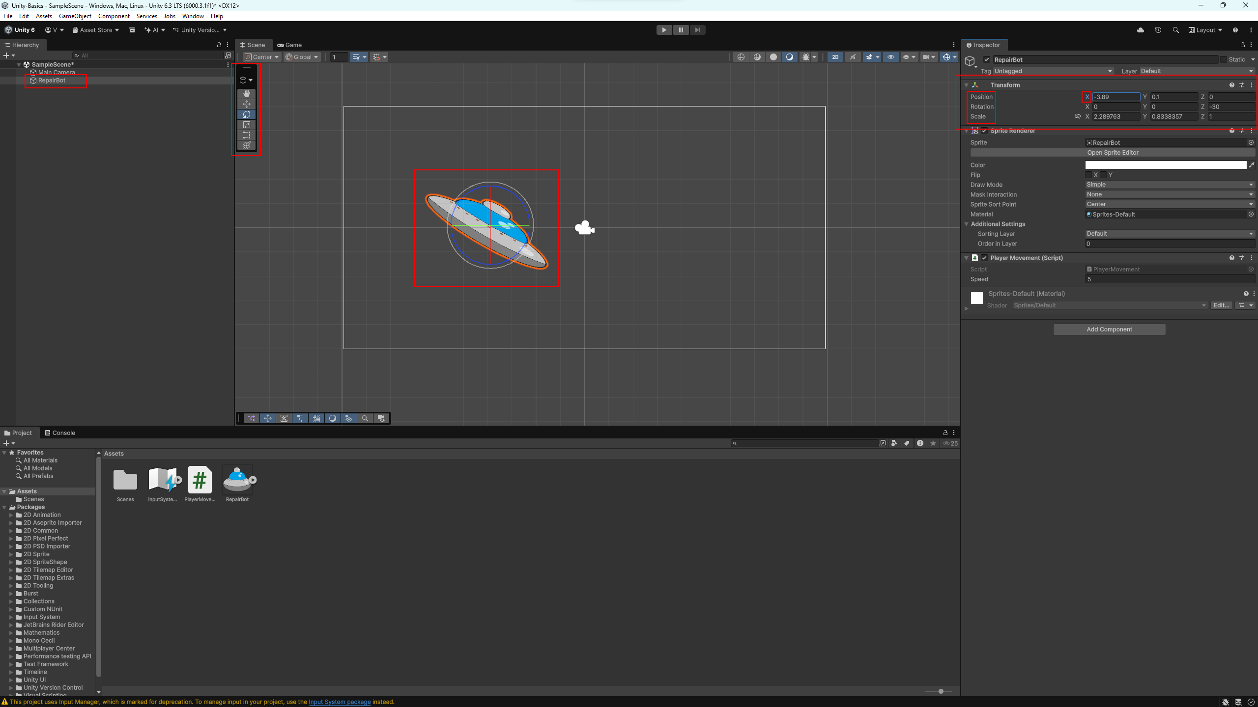 Now letโs create our own GameObject in the scene. In the Project (Assets) window, we already have the spaceship sprite that we imported in the previous steps.