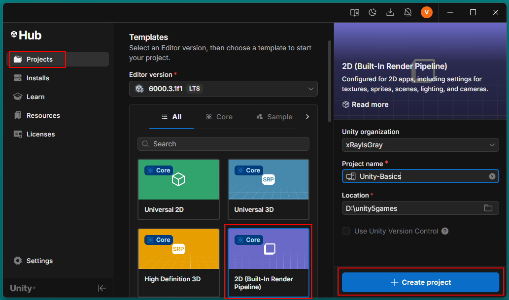 Open Unity Hub and go to the Projects tab. Click New Project and select the 2D Core (Built-in Render Pipeline) preset.