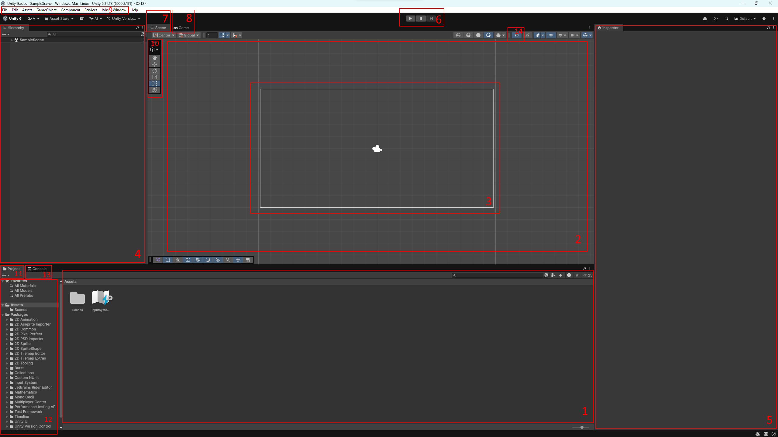 After creating and opening a project, the Unity Editor looks roughly like this. Below are the main windows and panels that you will work with on a regular basis.