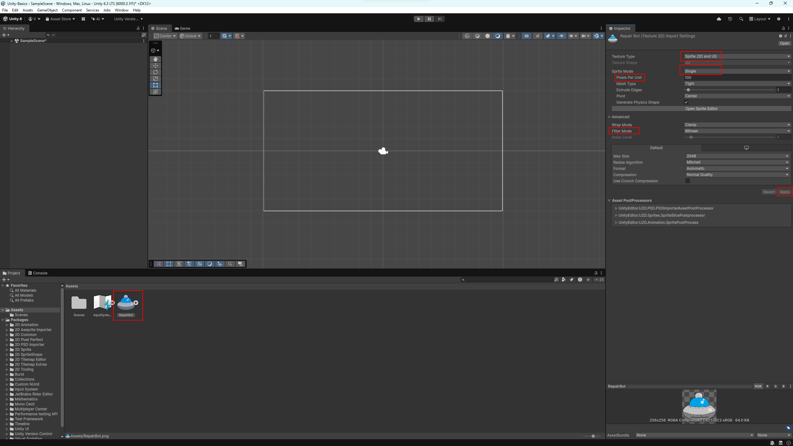 In most cases, Unity automatically selects appropriate settings for imported assets. If necessary, you can adjust them manually. To do this, select the required asset in the Project (Assets) window โ in this case, the spaceship sprite โ and view its parameters in the Inspector window.