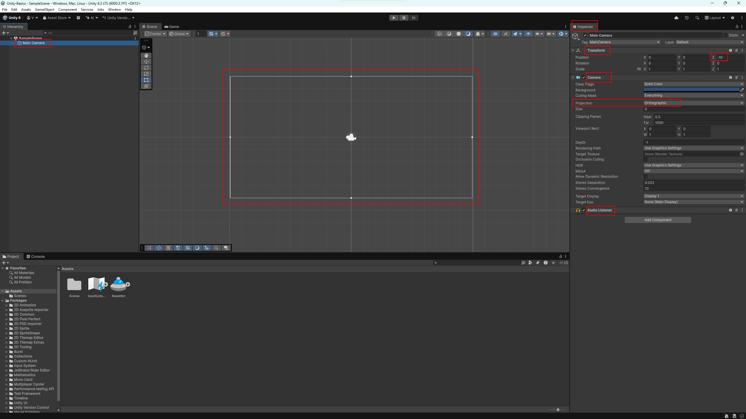 On the camera, you will see the Camera component, which is responsible for rendering the scene, as well as the Audio Listener component, which receives sound. It is the set of components that determines what kind of object a GameObject is and what role it plays.