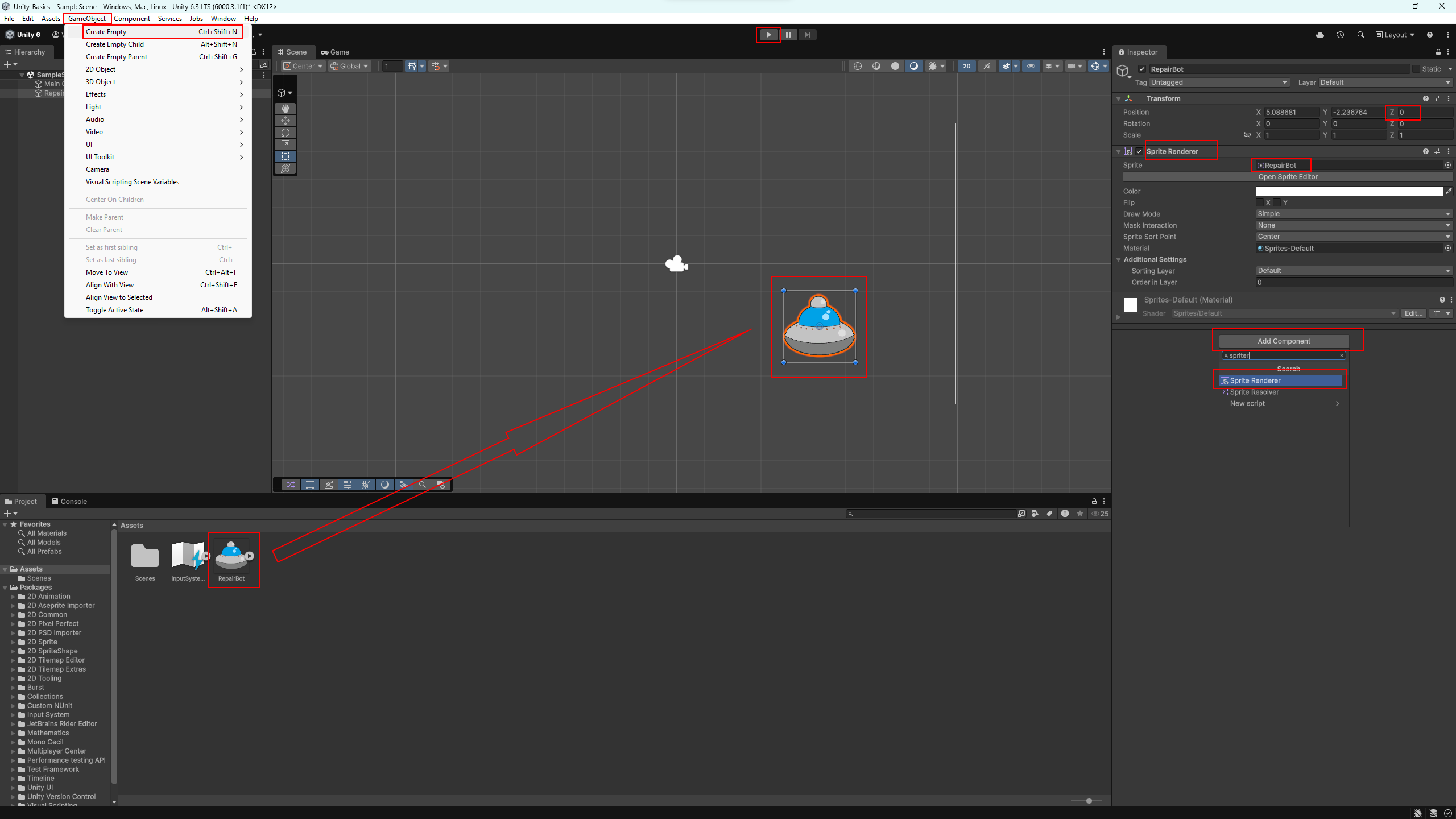 A GameObject can also be created in another way. Open the menu GameObject โ Create Empty to add an empty object to the scene. Select it, then in the Inspector window click Add Component and add the Sprite Renderer component. In the Sprite field, assign the spaceship sprite.