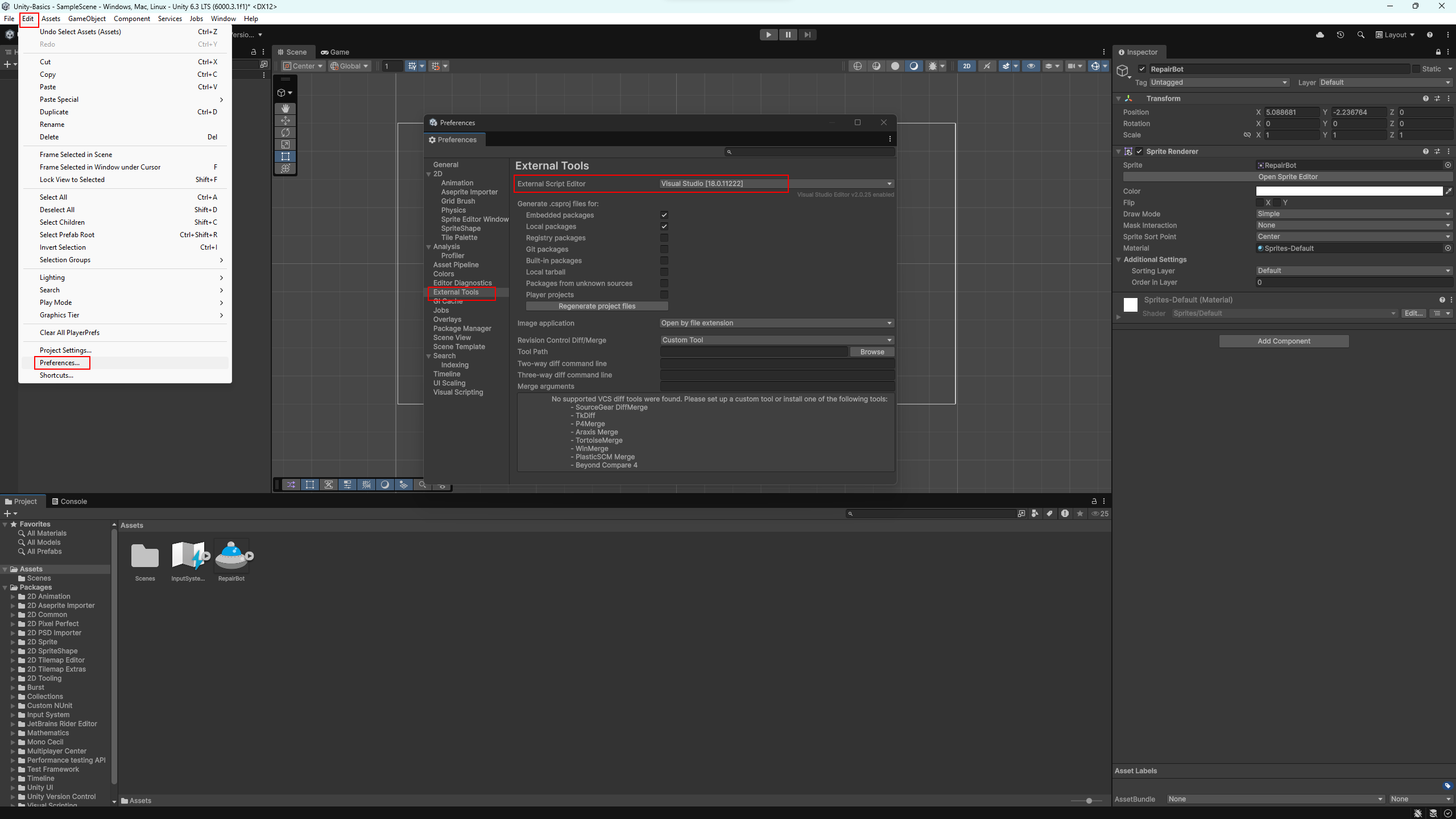 ๐ก To work with scripts, you need a code editor. Usually, Visual Studio is installed together with Unity (at the time of writing this tutorial โ Visual Studio 2026). You can check the selected editor in Edit โ Preferences โ External Tools. You may also use another editor, as long as it provides good support for Unity and C#.