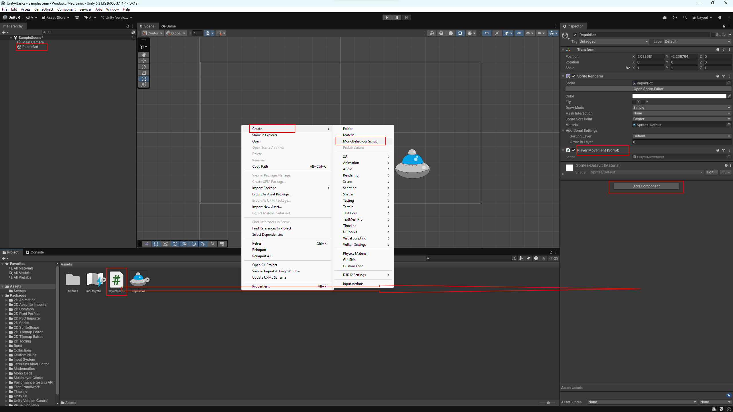 Now letโs create the script itself. In the Project (Assets) window, right-click and choose Create โ MonoBehaviour Script. Name the script PlayerMovement.